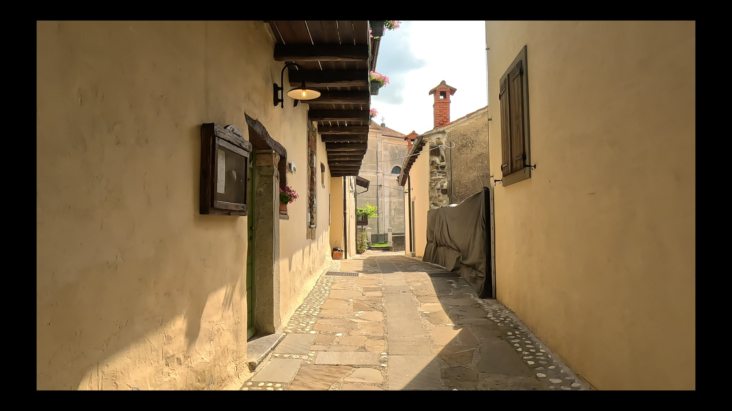 In Slovenië had ik ook een stop gepland in het pittoreske dorpje Šmartno. Ik parkeerde Monty en liep een stukje door het dorp. Šmartno straalt een middeleeuwse sfeer uit, met kleine, smalle straatjes achter kasteelmuren en doorkijkjes naar de omgeving.
